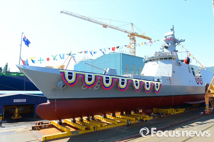 (서울=포커스뉴스) 2일 오후 경남 거제 대우조선해양에서 해군의 신형 호위함인 대구함이 모습을 드러내고 있다. 전투함 최초로 하이브리드 추진체계를 적용한 해군의 신형 호위함(FFG-Ⅱ, 2800톤급)인 대구함은 대공 · 대함 · 대잠 · 대지전까지 수행할 수 있다. <사진제공= 해군>