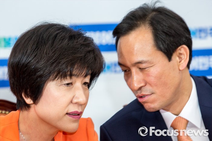 | △ 대화 나누는 우상호 원내대표-김영주 단장 |