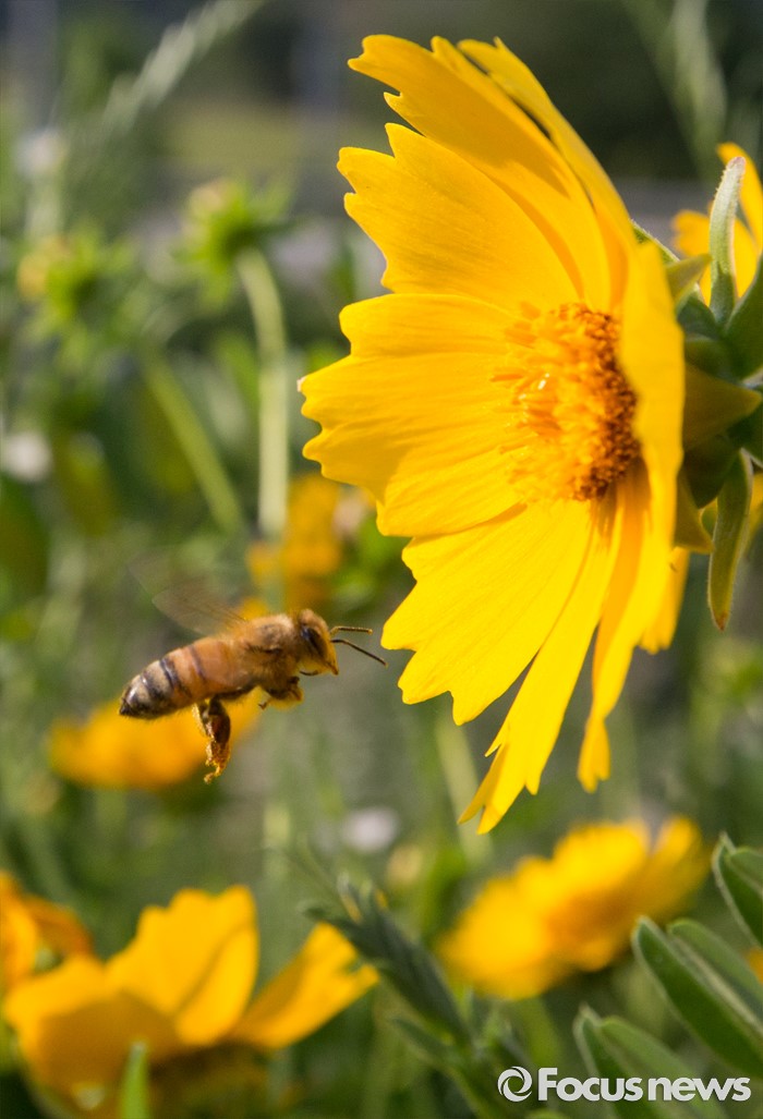 (충주=포커스뉴스) 2일 오후 충북 충주시 장성리 철도주변에 핀 금계국에서 꿀벌이 꽃가루를 채취하고 있다.