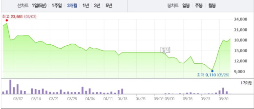현대상선은 5월27일과 28일, 31일에도 각각 가격제한폭인 29.65%, 29.92%, 13.56%의 상승폭을 기록한 바 있다.