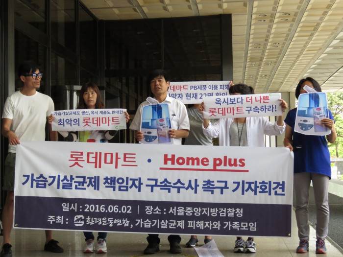 염형철 환경운동연합 사무총장은 "롯데마트와 홈플러스는 옥시레킷벤키저에 대한 검찰 수사가 진행되는 동안 자신의 잘못을 사과하기는커녕 여론이 지나가기만을 기다리고 있었다"며 "이들 대형마트도 자체 PB상품을 통해 피해자를 발생시킨 가해기업이다"고 강조했다.