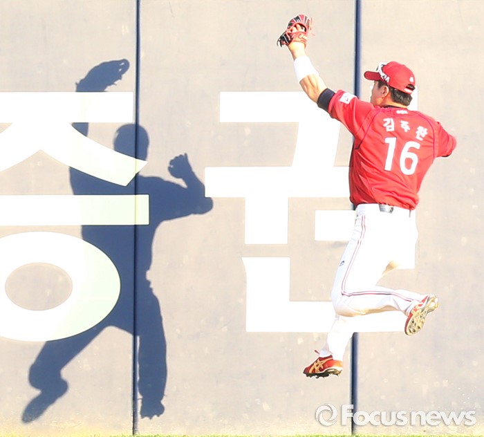 (서울=포커스뉴스) 2일 서울 잠실구장에서 열린 2016 프로야구 KIA-LG 경기 1회말 2사 1루에서 KIA 좌익수 김주찬이 LG 히메네스의 타구를 펜스 앞에서 점프하며 잡고 있다.