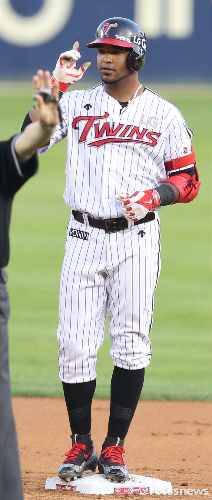 (서울=포커스뉴스) 2일 서울 잠실구장에서 열린 2016 프로야구 KIA-LG 경기 3회말 무사 1,2루에서 LG 히메네스가 1타점 2루타를 치고 2루 베이스 위에 서서 세리머니를하고 있다.