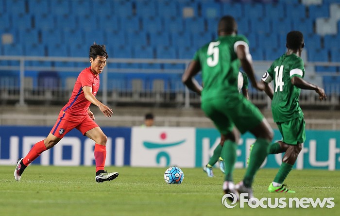 (수원=포커스뉴스) 2일 오후 경기 수원월드컵경기장에서 열린 2016 4개국 올림픽국가대표 축구대회 대한민국과 나이지리아의 경기에서 대한민국 심상민이 드리블을 하고 있다.
