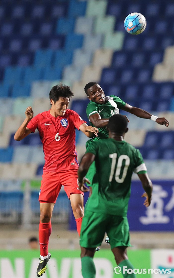 (수원=포커스뉴스) 2일 오후 경기 수원월드컵경기장에서 열린 2016 4개국 올림픽국가대표 축구대회 대한민국과 나이지리아의 경기에서 대한민국 박용우가 상대 선수와 공중 볼 다툼을 하고 있다.