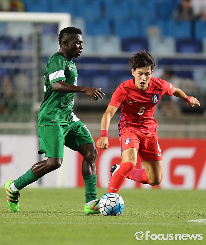 (수원=포커스뉴스) 2일 오후 경기 수원월드컵경기장에서 열린 2016 4개국 올림픽국가대표 축구대회 대한민국과 나이지리아의 경기에서 대한민국 박용우가 상대 선수를 수비하고 있다.