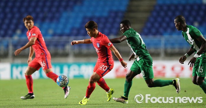 (수원=포커스뉴스) 2일 오후 경기 수원월드컵경기장에서 열린 2016 4개국 올림픽국가대표 축구대회 대한민국과 나이지리아의 경기에서 대한민국 황희찬이 상대선수와 볼 다툼을 하고 있다.
