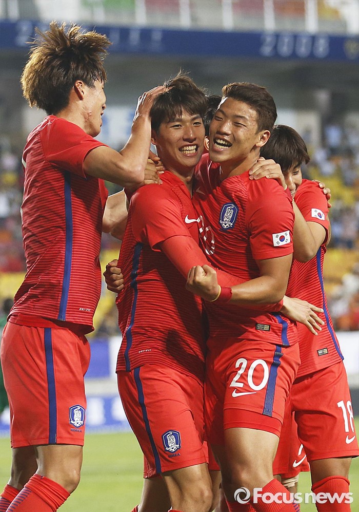 (수원=포커스뉴스) 2일 오후 경기 수원월드컵경기장에서 열린 2016 4개국 올림픽국가대표 축구대회 대한민국과 나이지리아의 경기에서 대한민국 최규백이 후반전 선제골을 넣고 선수들과 환호하고 있다.
