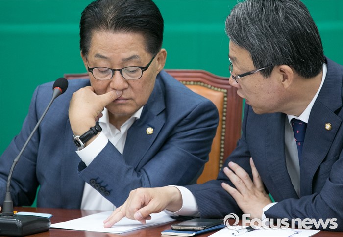 (서울=포커스뉴스) 3일 오전 서울 여의도 국회에서 열린 국민의당 최고위원회의에 참석한 박지원(왼쪽) 원내대표와 김성식 정책위의장이 대화하고 있다.
