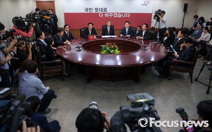 (서울=포커스뉴스) 김희옥(가운데) 새누리당 비상대책위원장과 정진석(왼쪽 다섯번째) 원내대표를 비롯한 비대위원들이 3일 오전 서울 여의도 새누리당 당사에서 열린 비상대책위원회의에 참석하고 있다.