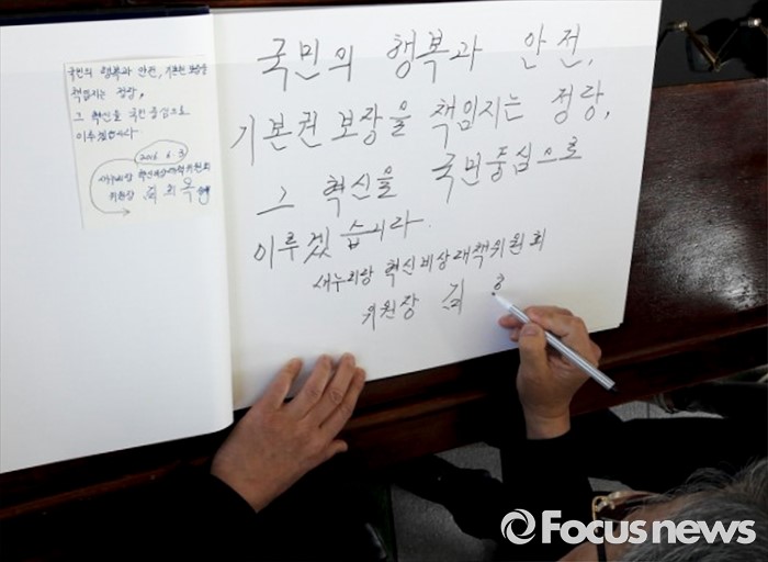 (서울=포커스뉴스) 김희옥 새누리당 혁신비대위원장이 3일 오전 동작구 국립서울현충원을 방문해 참배 후 방명록을 작성하고 있다.