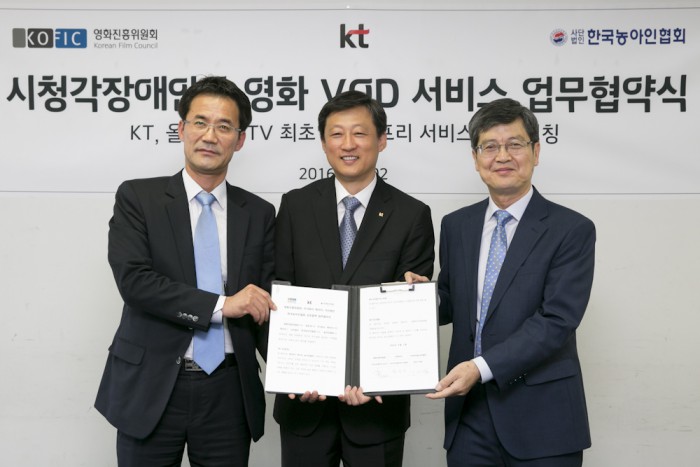 KT는 지난 2일 영화진흥위원회, 한국농아인협회와 올림픽공원 핸드볼경기장에서 장애인 영화관람 환경 개선과 한국영화 발전을 위한 협약을 체결했다. 영화진흥위원회는 배리어프리 영화 저작권 확보와 제작비용을 지원하고, 한국농아인협회는 한국영화의 한글자막 및 화면해설 콘텐츠를 제작해 올레tv를 통해 서비스하게 된다.