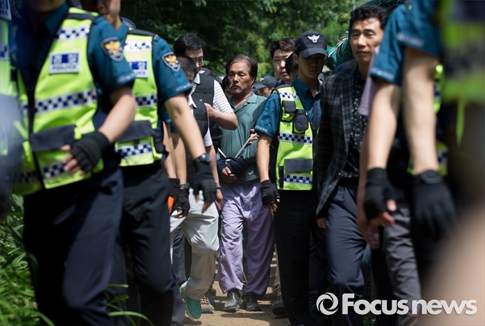 (서울=포커스뉴스) 지난 29일 서울 노원구 수락산 등산로에서 60대 여성을 살해한 피의자 김학봉(61)이 3일 오전 범행장소에서 현장검증을 마치고 호송차로 향하고 있다.