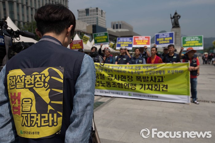 (서울=포커스뉴스) 3일 오전 서울 종로구 광화문광장에서 건설산업연맹원들이 남양주 지하철 폭발 및 붕괴사고에 대해 책임자 처벌과 건설현장 안전문제 대책 마련을 촉구하며 기자회견을 하고 있다.