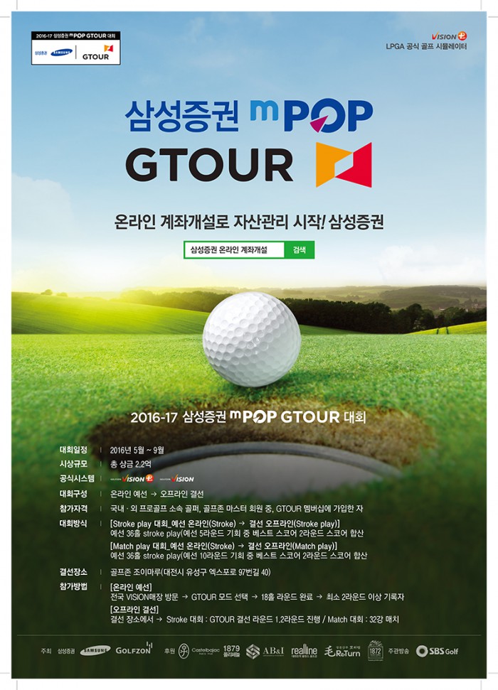 1차 대회 결선은 오는 20일 밤 10시30분 SBS 골프 채널을 통해 녹화방송될 예정이다.'2016-17시즌 삼성증권 mPOP GTOUR 대회' 개막을 알리는 포스터.<사진제공=골프존>
