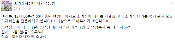 '한일 ‘위안부’ 합의 폐기! 소녀상 철거 반대! 대학생행동(대학생행동)'은 "소녀상 테러를 사주한 배후를 철저히 수사해줄 것을 당국에 촉구하겠다"며 이날 오후 5시 서울 종로구 일본대사관 맞은편에서 기자회견을 연다고 밝혔다.