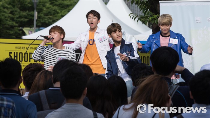 (서울=포커스뉴스) 3일 오후 서울 광진구 건대입구 스타시티 광장에서 가수 송유빈(왼쪽 세번째)이 거리공연을 하고 있다.