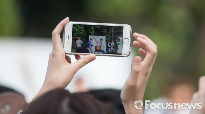 (서울=포커스뉴스) 3일 오후 서울 광진구 건대입구 스타시티 광장에서 가수 송유빈의 거리공연을 한 시민이 촬영하고 있다.