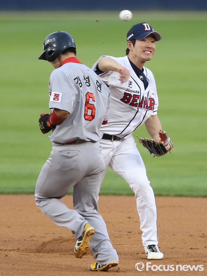 (서울=포커스뉴스) 3일 서울 잠실구장에서 열린 2016프로야구 SK-두산 경기 3회초 1사 1,2루에서 SK 박재상의 2루 땅볼때 두산 유격수 김재호가 1루주자 김성현을 2루에서 포스아웃 시킨후 1루로 송구하고 있다. 더블플레이 성공.