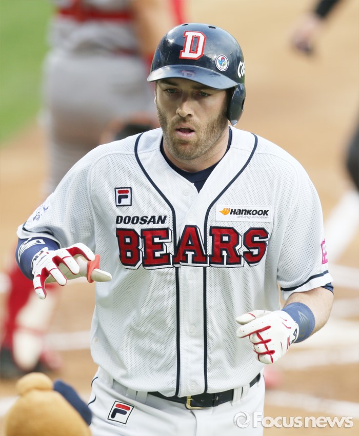 (서울=포커스뉴스) 3일 서울 잠실구장에서 열린 2016프로야구 SK-두산 경기 2회말 두산 에반스가 좌월 솔로 홈런을 치고 홈인하고 있다.