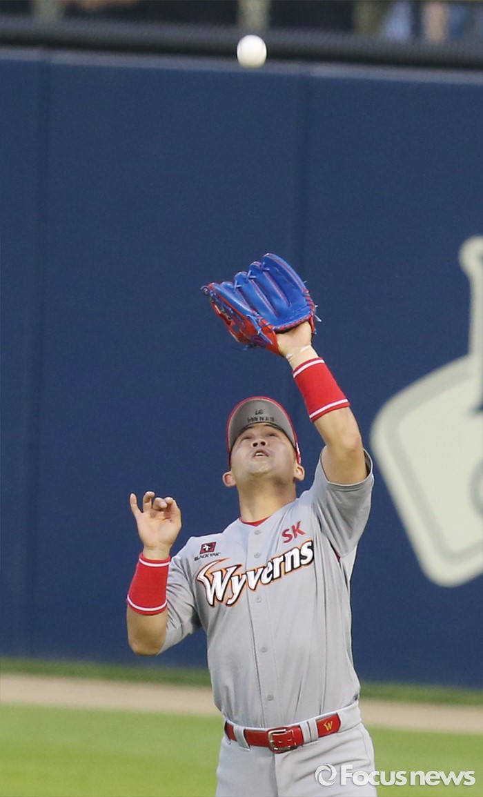 (서울=포커스뉴스) 3일 서울 잠실구장에서 열린 2016프로야구 SK-두산 경기 3회말 1사 만루에서 SK 우익수 정의윤이 두산 에반스의 뜬공 타구를 잡고 있다.