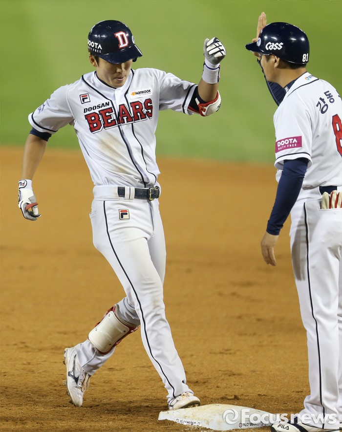 (서울=포커스뉴스) 3일 서울 잠실구장에서 열린 2016프로야구 SK-두산 경기 6회말 무사 1루에서 두산 허경민이 주자를 3루까지 보내는 좌전 안타를 치고 1루 베이스를 밟고 있다.