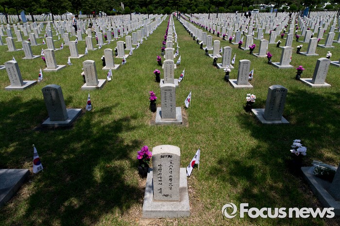 (서울=포커스뉴스) 현충일을 하루 앞둔 5일 오전 서울 동작구 국립서울현충원을 찾은 유족들이 묘역에 참배하고 있다.