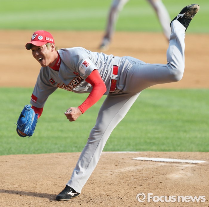 (서울=포커스뉴스) 5일 서울 잠실구장에서 열린 2016프로야구 SK-두산 경기에서 1회말 SK 선발투수 김광현이 투구하고 있다.