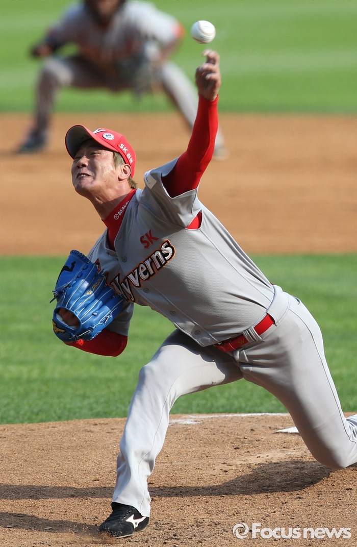 (서울=포커스뉴스) 5일 서울 잠실구장에서 열린 2016프로야구 SK-두산 경기에서 1회말 SK 선발투수 김광현이 투구하고 있다.