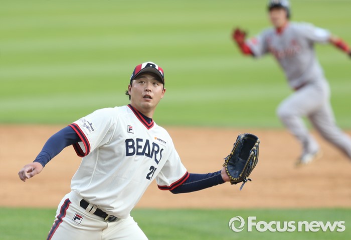 (서울=포커스뉴스) 5일 서울 잠실구장에서 열린 2016프로야구 SK-두산 경기에서 두산 투수 안규영이 5회초 2사 2,3루의 실점 위기에서 SK 이명기의 2루 땅볼 타구를 쫓고 있다.