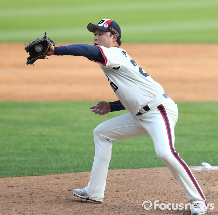 (서울=포커스뉴스) 5일 서울 잠실구장에서 열린 2016프로야구 SK-두산 경기에서 두산 투수 안규영이 4회초 1사 1루에서 SK 정의윤의 타구를 잡고 있다.