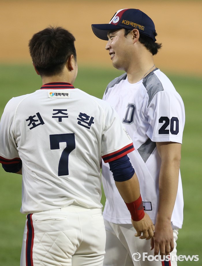 (서울=포커스뉴스) 5일 서울 잠실구장에서 열린 2016프로야구 SK-두산 경기에서 프로 진출 6년만에 첫 승을 올린 두산 투수 안규영에게 최주환이 축하해 주고 있다.