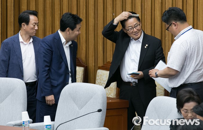 (서울=포커스뉴스) 6일 오전 서울 여의도 국회에서 박지원(오른쪽 두번째) 국민의당 원내대표가 20대 국회 원구성 협상 등과 관련 기자간담회에 앞서 머리 빗질을 하고 있다.