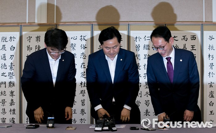 (서울=포커스뉴스) 6일 오후 서울 여의도 국회 귀빈식당에서 열린 20대 국회 원구성 협상 등을 위한 회동에 참석한 김도읍(오른쪽) 새누리당 원내수석부대표, 박완주(왼쪽) 더불어민주당 원내수석부대표, 김관영 국민의당 원내수석부대표가 취재진을 향해 포즈를 취한 뒤 자리에 앉고 있다.
