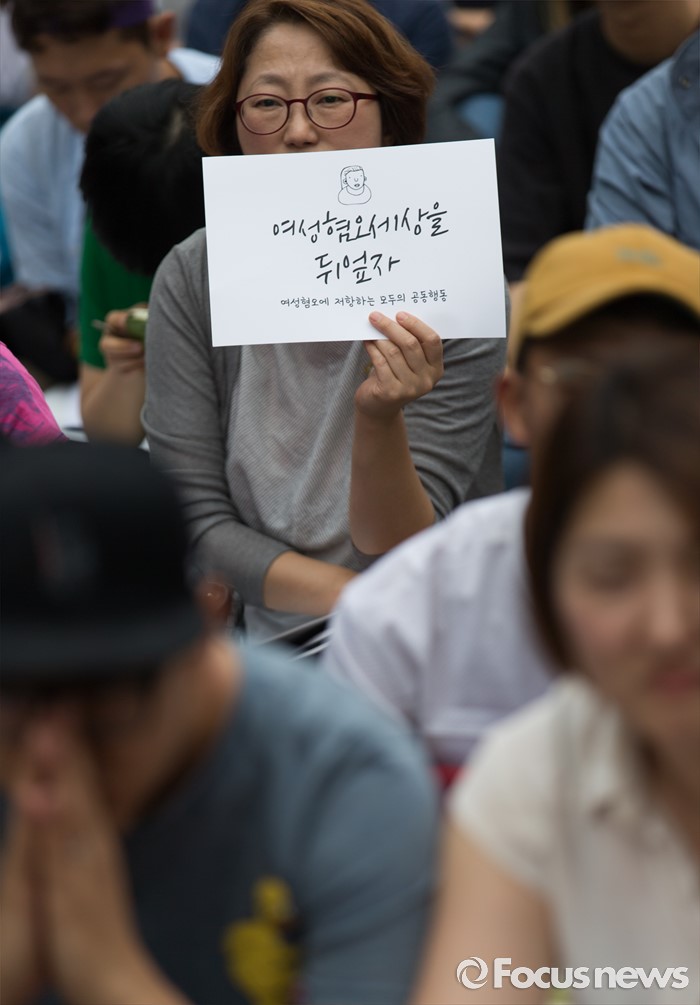 (서울=포커스뉴스) 6일 오후 서울 마포구 나루수산 앞 광장에서 열린 '여성 혐오에 저항하는 모두의 1차 공동행동-여성 혐오세상을 뒤엎자' 집회에 참석한 여성단체 회원이 여성 혐오를 규탄하는 손팻말을 들고 있다.