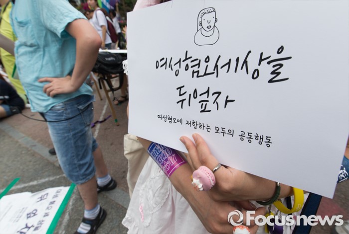 (서울=포커스뉴스) 6일 오후 서울 마포구 나루수산 앞 광장에서 열린 '여성 혐오에 저항하는 모두의 1차 공동행동-여성 혐오세상을 뒤엎자' 집회에 참석한 여성단체 회원이 여성 혐오를 규탄하는 손팻말을 들고 있다.