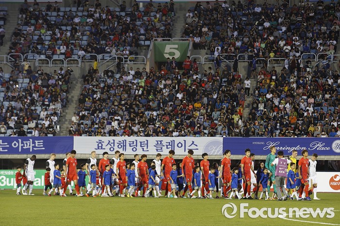(부천=포커스뉴스) 6일 오후 경기 부천종합운동장에서 열린 2016 4개국 올림픽국가대표 축구대회 대한민국과 덴마크의 경기에서 양팀 선수들이 입장하고 있다.