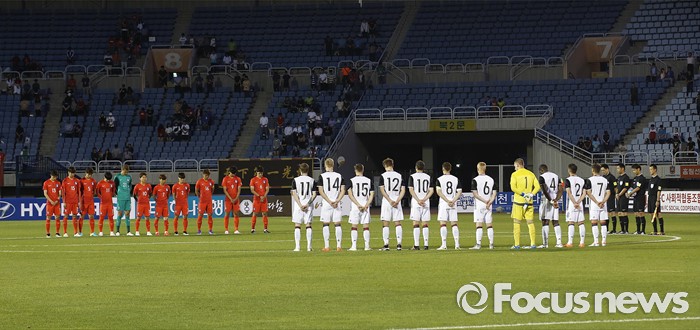 (부천=포커스뉴스) 6일 오후 경기 부천종합운동장에서 열린 2016 4개국 올림픽국가대표 축구대회 대한민국과 덴마크의 경기에서 선수들이 묵념하고 있다.