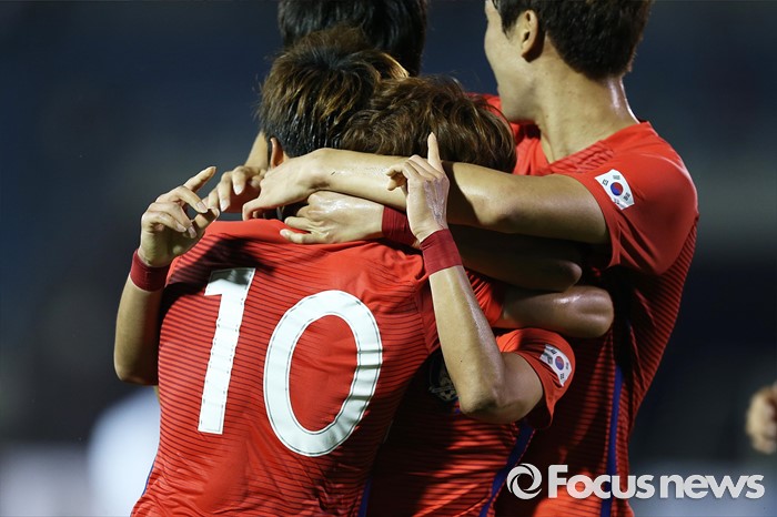 (부천=포커스뉴스) 6일 오후 경기 부천종합운동장에서 열린 2016 4개국 올림픽국가대표 축구대회 대한민국과 덴마크의 경기에서 대한민국 문창진이 선제골을 넣고 선수들과 환호하고 있다.