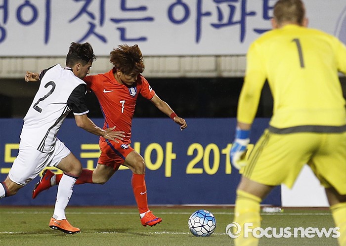 (부천=포커스뉴스) 6일 오후 경기 부천종합운동장에서 열린 2016 4개국 올림픽국가대표 축구대회 대한민국과 덴마크의 경기에서 대한민국 문창진이 상대선수와 볼 다툼을 하고 있다.