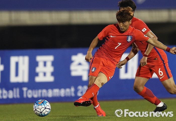 (부천=포커스뉴스) 6일 오후 경기 부천종합운동장에서 열린 2016 4개국 올림픽국가대표 축구대회 대한민국과 덴마크의 경기에서 대한민국 문창진이 스루패스를 하고 있다.