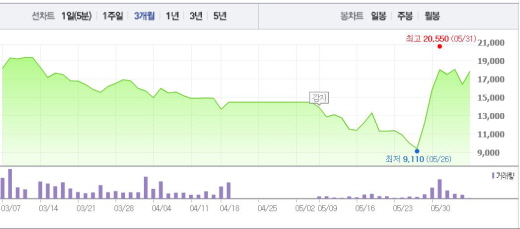 앞서 현대상선은 내년 말까지 만기가 돌아오는 8043억원의 회사채 채무재조정에 성공했다. 구조조정의 중심인 용선료 인하 협상도 이번 주 최종 타결될 것으로 예상되고 있다.주가흐름<사진출처=네이버 캡쳐>