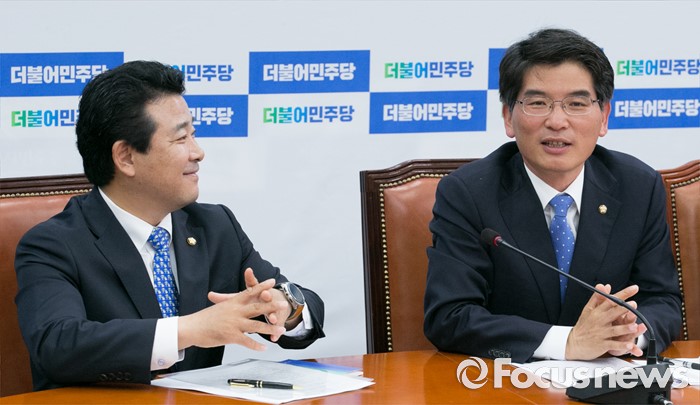 (서울=포커스뉴스) 7일 오전 서울 여의도 국회에서 열린 더불어민주당 원내대책회의에 참석한 박완주(오른쪽) 원내수석부대표가 박정 원내부대표의 외교부 해체 발언과 관련 취재진의 이해를 구하고 있다.
