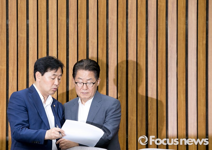 (서울=포커스뉴스) 7일 오전 서울 여의도 국회에서 열린 국민의당 의원총회에 참석한 박지원(오른쪽) 원내대표와 김관영 원내수석부대표가 대화하고 있다.
