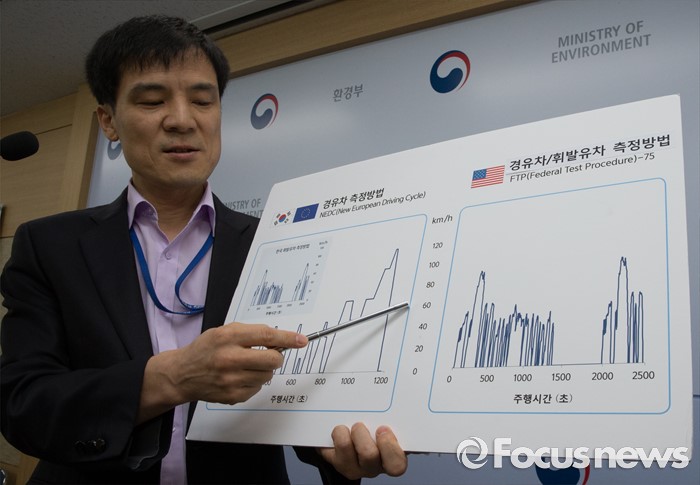 (세종=포커스뉴스) 홍동곤 환경부 교통환경과장이 7일 오전 세종시 정부세종청사 환경부 기자실에서 한국, 유럽연합, 미국의 경유차와 휘발류차 배출가스 측정방법에 대한 비교를 설명하고 있다.