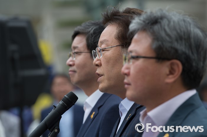 (서울=포커스뉴스) 7일 오전 서울 종로구 광화문광장에서 염태영(왼쪽부터) 수원시장, 이재명 성남시장, 채인석 화성시장이 정부의 지방재정개편안에 반대하는 단식농성 기자회견을 열고 있다.