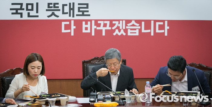 (서울=포커스뉴스) 김희옥 새누리당 혁신비대위원장이 7일 오후 서울 여의도 당사에서 청년 사무처 당직자와의 도시락 간담회를 하고 있다.