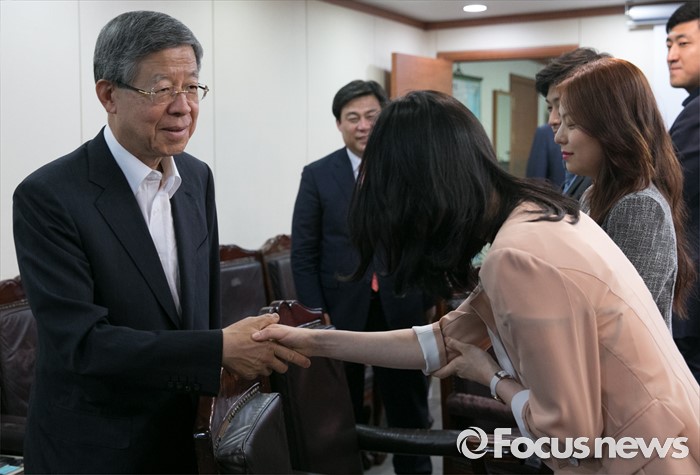 (서울=포커스뉴스) 김희옥(왼족) 새누리당 혁신비대위원장이 7일 오후 서울 여의도 당사에서 청년 사무처 당직자와의 도시락 간담회에 참석해 인사하고 있다.