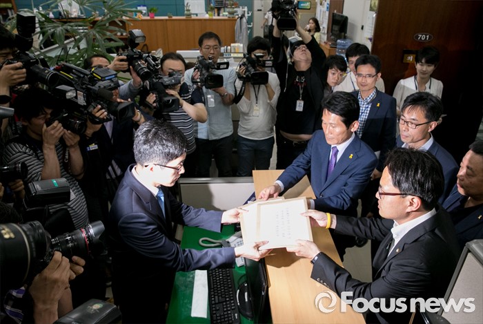 (서울=포커스뉴스) 박주민 더불어민주당 의원과 윤소하 정의당 의원, 전명선 4·16가족협의회 운영위원장, 유경근 집행위원장 등이 7일 오후 서울 여의도 국회 의안과에서 세월호 특별법 개정안 등을 제출하고 있다.