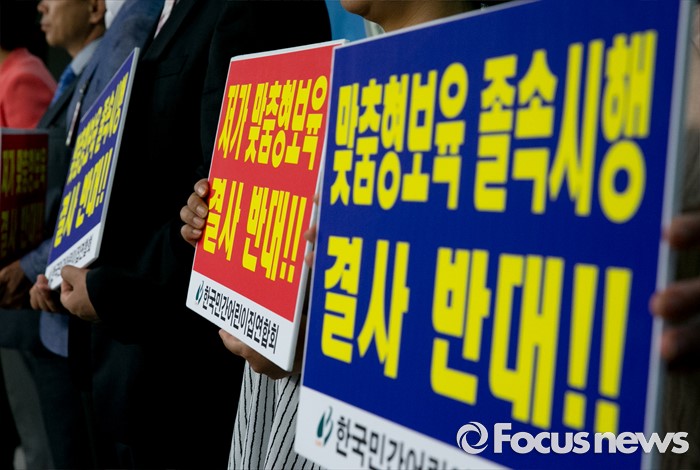 종일반의 입반 대상은 '맞벌이 부부', '한부모 가정', '다자녀 가구' 등의 영아로 제한되며 이 외에는 '맞춤형'으로 분류돼 1일 6시간만 어린이집을 이용할 수 있다. 다만 맞춤형 가정에는 월15시간의 긴급보육바우처가 지급해 필요하면 나눠서 사용할 수 있도록 했다.(서울=포커스뉴스) 31일 오전 서울 여의도 국회 정론관에서 한정애 더불어민주당 의원과 장진환 한국민간어린이집연합회장 등 관계자들이 어린이집 생존권 위협하는 맞춤형 보육 철회 촉구 기자회견을 하고 있다. 2016.05.31 박동욱 기자